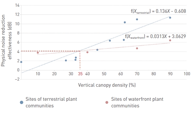 陆域及滨水植物群落降噪效能与垂直郁闭度的关系示意图