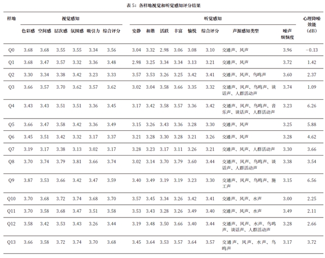 就视觉感知评价结果而言,滨水植物群落的体验总体更优。在听觉感知方面,Q13的综合评分最高,Q0最低。综合对比14个样地,Q9和Q4的心理降噪效能最佳;心理降噪效能最低的是Q0。