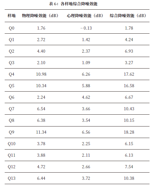 在陆域植物群落样地中,除Q6外,植物群落的物理降噪效能总体优于心理降噪效能,且物理、心理和综合降噪效能的变化特征相似。其中,综合降噪效能最佳的是Q9,其垂直郁闭度较高,植物种植密集,形成了良好的物理噪声屏障,同时色彩感较好,心理降噪效能较高。