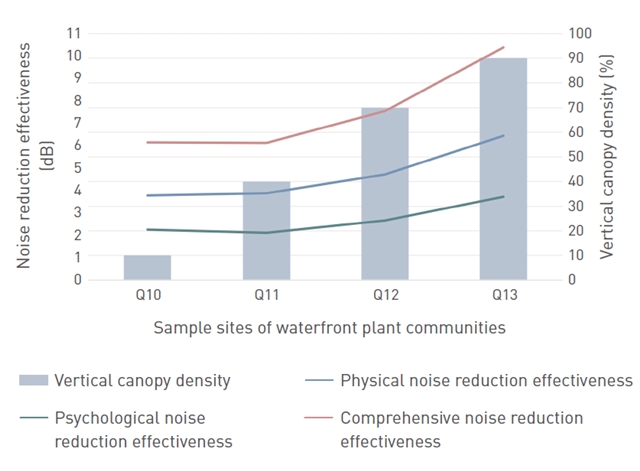 滨水植物群落的综合降噪效能与垂直郁闭度呈现一定的相关性。具体而言,滨水植物群落的物理降噪效能随垂直郁闭度的上升而增强。