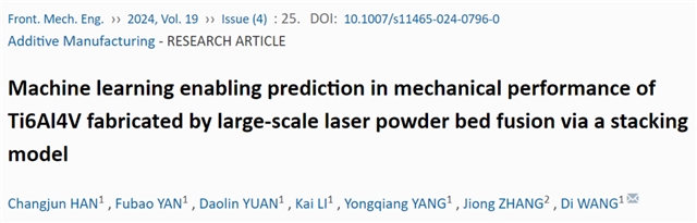 华南理工大学杨永强教授、王迪教授、韩昌骏副教授研究团队在《Frontiers of Mechanical Engineering》2024年19卷第4期发表了题为“Machine learning enabling prediction in mechanical performance of Ti6Al4V fabricated by large-scale laser powder bed fusion via a stacking model”的研究论文。研究提出了一种基于堆叠集成学习的数据驱动方法,预测大尺寸激光粉末床熔融(LPBF)技术成形的Ti6Al4V合金力学性能。