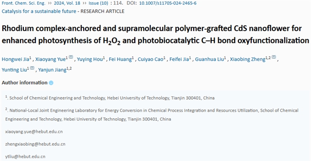 河北工业大学刘运亭和郑晓冰等在《化学科学与工程前沿》(英文)期刊发表题为“Rhodium complex-anchored and supramolecular polymer-grafted CdS nanoflower for enhanced photosynthesis of H2O2 and photobiocatalytic C–H bond oxyfunctionalization”(铑配合物锚定和超分子聚合物接枝硫化镉纳米花——用于强化光合成过氧化氢及光生物催化C-H键氧官能化)的研究论文,旨在开发一种新型异质结光催化剂,通过增强光合成H2O2效率并将其与UPO结合构建级联催化体系,实现对惰性C–H键的高效、选择性氧化。