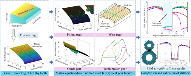本篇研究论文发表于《Frontiers of Mechanical Engineering》2024年19卷第3期,题为“Unified method for typical gear failure modeling and stiffness calculation based on the matrix equation”。文章提出了一种基于矩阵方程的典型齿轮故障建模与时变啮合刚度(TVMS)计算的统一方法,旨在解决不同损伤建模及相应计算缺乏统一标准而导致刚度结果存在偏差的问题。研究将齿轮轮齿离散为大量用矩阵表示的微元,通过调整矩阵微元值构建了包括齿面无规则形状点蚀、非均匀磨损、三维齿根裂纹和非均匀断齿在内的典型齿轮故障统一模型,该模型与势能法(PEM)参数变量物理意义相同,可完美匹配。利用该统一方法对健康和故障齿轮进行建模,并结合PEM计算相应的TVMS。研究分析了不同故障类型影响TVMS的机制,如点蚀使接触宽度减小、刚度降低;磨损随转速和时间增加,刚度下降;裂纹深度和扩展角增加,刚度减小;断齿使故障轮齿参与啮合时间减少,刚度变化明显。通过有限元方法对统一方法计算的刚度结果进行验证,证明其准确性。该统一方法为研究不同故障类型齿轮系统的动态响应特性提供了有效技术手段,未来将用于传动系统的动态响应和故障诊断研究。
