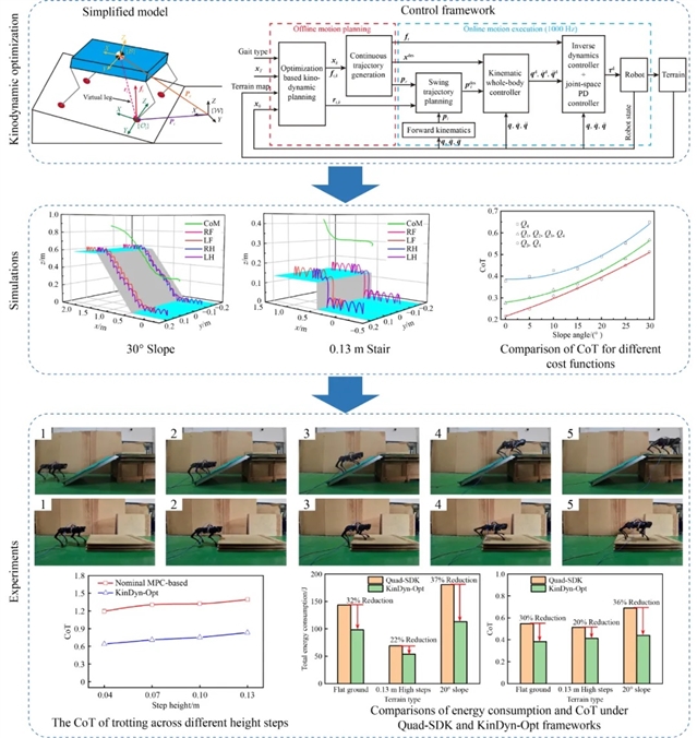 本篇研究论文发表于《Frontiers of Mechanical Engineering》2024年19卷第3期,题为“Dynamic motion of quadrupedal robots on challenging terrain: a kinodynamic optimization approach”。本文提出了一种基于运动-动力学优化的运动规划与控制方法(KinDynOpt),旨在解决四足机器人在复杂地形(如陡坡、高台阶)上的动态运动问题。研究将运动规划问题转化为优化问题,把四足机器人在复杂地形上的运动规划视为躯干运动轨迹、接触力和立足点位置的协同规划问题,以生成平滑且节能的运动。通过建立简化的机器人动力学模型,设置包含终端成本和中间成本的复合目标函数,并考虑运动学、接触、地形等多种约束条件,构建了非线性规划问题求解框架。基于优化得到的离散状态和控制变量,利用多项式插值生成连续的参考轨迹,并设计摆动框架规划摆动轨迹,以确保与地形有足够的离地间隙。为准确执行规划运动,开发了全身控制器,通过运动学全身控制器计算关节位置、速度和加速度命令,再由逆动力学控制器结合关节空间PD控制器生成最终的关节扭矩命令。研究通过仿真和实验对所提方法进行验证,在四足机器人A1上进行了跨越陡坡和攀爬高台阶等测试。结果表明,该方法能使机器人成功穿越30°斜坡和43%的名义腿长高台阶,且保持动态小跑步态的节律,在能量效率和运动稳定性方面表现出色。未来,研究团队将致力于实现该规划方法的在线应用,主要途径是减少优化计算时间,如利用优化问题的稀疏性特点或采用改进的初始化策略。