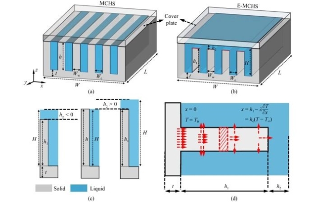 文章首先阐述了E-MCHS通过提升盖板(h2>0)或截断鳍片(h2<0)形成扩展空间,增加冷却剂流通面积。