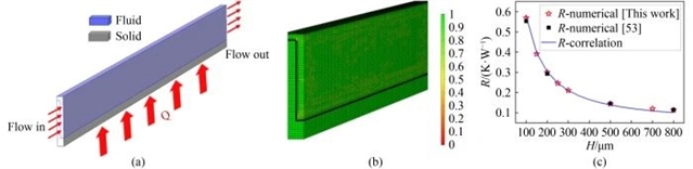 利用修订后的经验相关1D热阻模型和数值模拟,计算MCHS和E-MCHS的传热和流动性能,并计算了E-MCHS的鳍片效率。在此过程中考虑了鳍片与冷却液在顶部表面的传热,从而改进1D热阻模型,使其能更精准地反映热传递过程。构建3D流动和传热共轭数值模型,对流体和固体区域设置相应假设和方程。通过设定入口、出口条件及热通量等参数求解方程,获取速度和温度分布,进而计算热阻。经与文献数据及关联式对比,验证了模型的准确性。