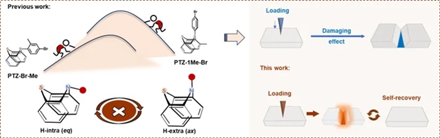 以吩噻嗪衍生物为例,通过N反转或环反转,具有两种不同的构象:eq构象(H-intra)和ax构象(H-extra),在不同构象下具有完全不同的发射性质。例如,具有ax-构象的PTZ-1Me-Br在聚集状态下表现出RTP,而具有eq-构象的PTZ-Br-Me则没有(图1),但因巨大位阻导致的能垒,二者无法自由转换。这就像被卡死的变形金刚,空有变化潜力却无法施展。如何让材料像“弹簧”一样灵活响应外力的刺激作用并自动复原?这一难题长期制约智能材料发展。