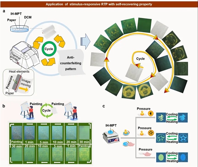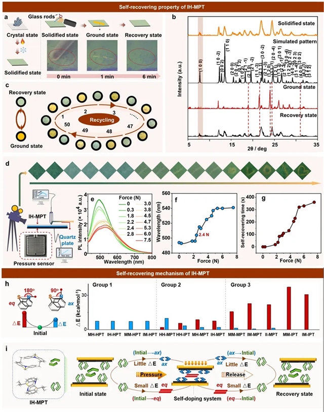 (1) 动态发光切换:外力作用下,IH-MPT发射波长从494 nm红移至550 nm,发光由绿变橙;撤去外力后6分钟内恢复初始状态,循环50次后性能无衰减(图3a-c)。