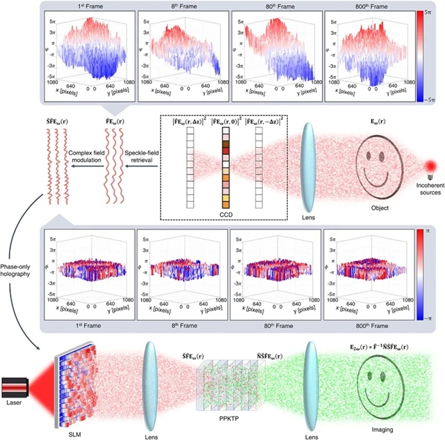 图 2 详细展示了实验过程。研究人员首先使用由 800 帧随机散斑组成的完全非相干光源照射印有 “笑脸” 图案的物体,生成基频光的散斑场。然后通过数值方法提取这些散斑场的复数场分布,并利用振幅和相位调制对光场进行编码,将目标相干性嵌入其中。接着,把经过调制的散斑场加载到空间光调制器上,用以塑造进入非线性晶体的泵浦光。最后,通过非线性晶体产生的二次谐波散斑在远场处经过统计平均后,一个清晰的 “笑脸” 图案得以成功还原。