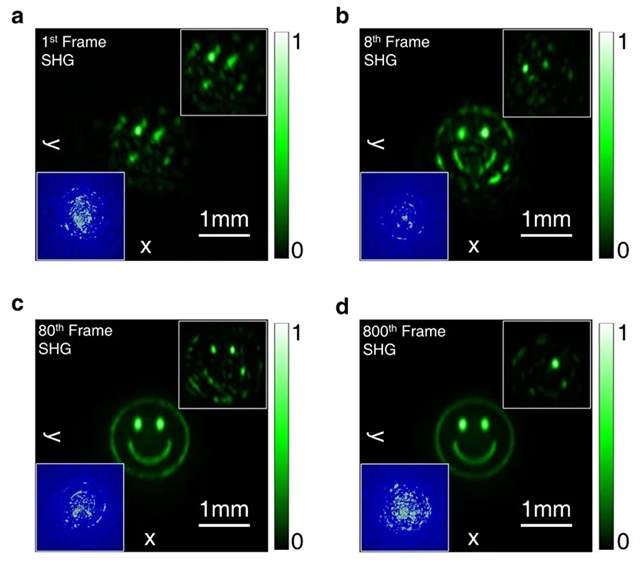 图3. “笑脸”图案逐步形成的过程: (a) -(d) 随着二次谐波散斑帧数的增加,图案从模糊到清晰,至 800 帧完整呈现。