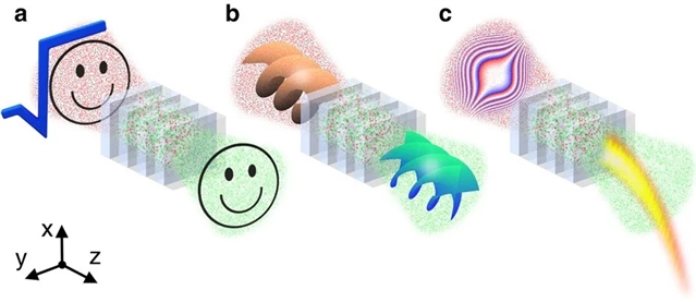 图1. 利用二次谐波实现:(a) 合成“笑脸”图案的相干性结构; (b) 轨道角动量守恒的非相干涡旋光束; (c) 具有自加速特性的非相干艾里光束。
