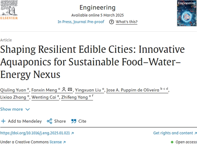 北京师范大学孟凡鑫科研团队在中国工程院院刊《Engineering》发表题为 “Shaping Resilient Edible Cities: Innovative Aquaponics for Sustainable Food–Water–Energy Nexus”(塑造韧性可食用城市:面向可持续食物–水–能源耦合的创新鱼菜共生系统)的研究性文章。研究表明,鱼菜共生系统作为一种创新的循环农业模式,为城市食物系统的可持续转型带来新的思路,有助于塑造具有韧性的可食用城市。袁秋玲为第一作者,孟凡鑫为通讯作者。