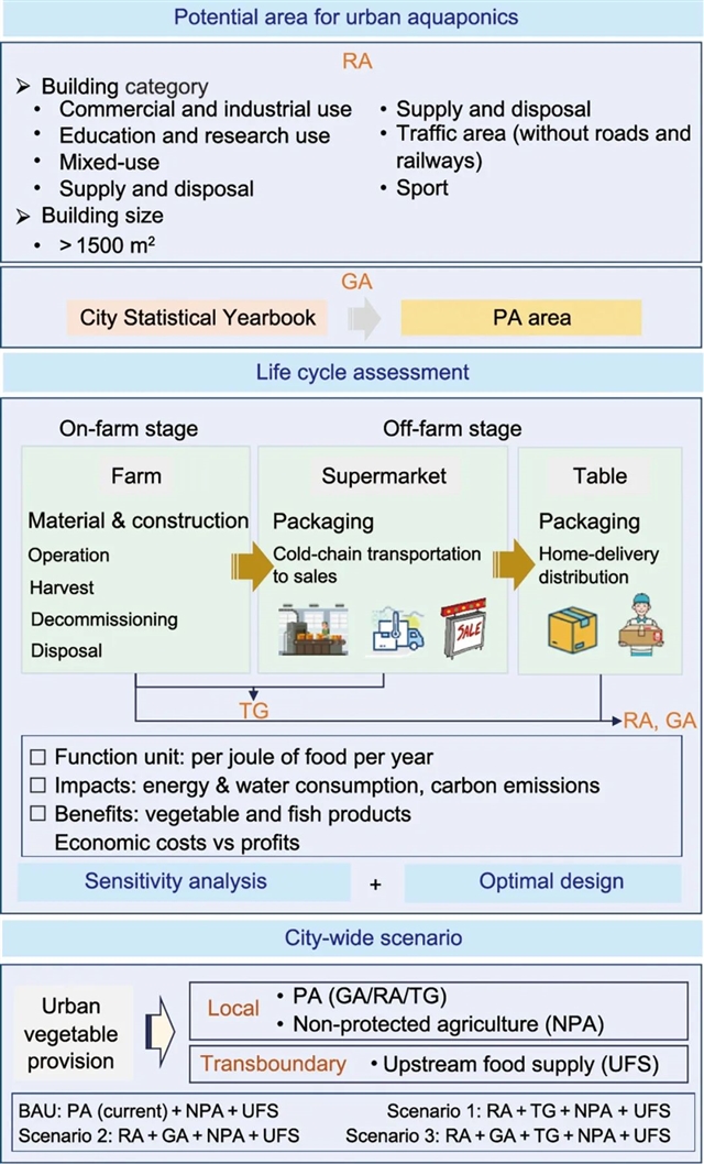 为此,研究团队构建了食物–水–能源(FWE)耦合视角下城市农业可持续性评估框架。该框架包含四个核心模块,即城市鱼菜共生潜力识别、全生命周期环境与经济成本评估、敏感性分析与优化设计以及城市尺度情景模拟。研究以北京市为案例,对屋顶鱼菜共生(RA)、地面鱼菜共生(GA)与传统温室农业(TG)进行对比分析。