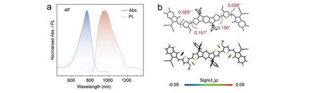 图2. (a) 4F在四氢呋喃中的吸收和发光光谱。(b) 4F的优化构型及分子内S···O非共价作用。