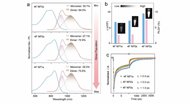 3、基于上述机制认识,研究团队采用纳米工程策略进行聚集态调控。通过在荧光纳米粒子的制备过程中调控4F的浓度,使纳米粒子中二聚体占比从73.5%下降至64.3%,有效抑制了聚集体中二聚体的形成,削弱了分子间非辐射跃迁过程(寿命从 0.4 ps 延长到 1 ps),成功构建了高亮度的水溶性纳米荧光染料4F NP3s。