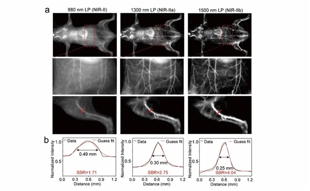 4、优化的4F NP3s在NIR-II荧光成像中展现出优异的亮度与空间分辨率,可在小鼠体内实现清晰的全身血管可视化。特别是在NIR-IIb窗口(>1500 nm)下,其成像信噪比(SBR)高达4.04,显著优于常规NIR-II窗口(900–1300 nm)下的SBR值(1.71和2.75)。对腹部及腿部区域的高倍率成像进一步验证了其出色的空间分辨能力。上述结果表明,4F NP3s在高分辨率生物成像领域具有广阔的应用前景。