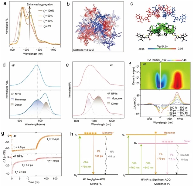 图3. (a) 4F在不同聚集程度下的发射光谱。(b) 聚集状态下4F的分子动力学模拟。(c) 优化的二聚体构型及分子间非共价作用。(d, e) 4F NP1s的吸收光谱以及发光光谱拆分图。(f) 飞秒瞬态吸收光谱。(g) 单波长动力学行为曲线拟合。(h) 激发态动力学行为示意图。