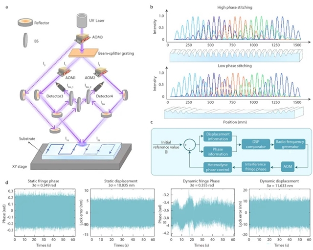 工作台定位误差、光学元件振动,外界环境扰动及光源的抖动都会带来曝光精度的下降,系统对干涉条纹稳定性控制精度要求极高。为解决上述问题,提出了高精度干涉条纹相位锁定技术,创建了扫描干涉场动态相位锁定模型,开发了外差相位数据高速采集方法,对曝光过程中干涉条纹相位误差进行动态补偿,实现了干涉条纹与光栅基底相对位置的高精度协同控制。