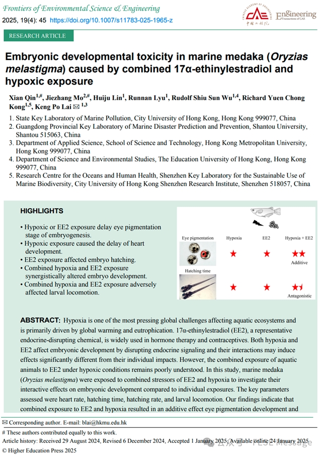 本文内容来自FESE期刊2025年第19卷第4期发表的研究文章“Embryonic developmental toxicity in marine medaka (Oryzias melastigma) caused by combined 17α-ethinylestradiol and hypoxic exposure”。通讯作者为香港城市大学的黎镜波助理教授。