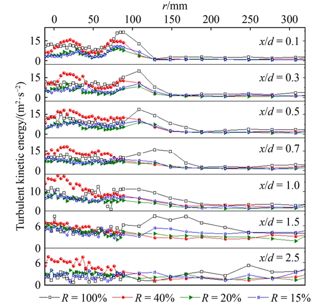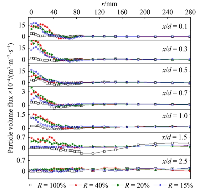 实验发现,DPRB在不同负荷下均存在稳定回流区。满负荷时,中心回流区长度为1.5d(d为出口直径)、直径0.58d;当负荷降至40%、20%与15%时,回流区转为环形,直径分别为0.30d、0.40d与0.39d,长度稳定为1.0d。低负荷下,环形回流区的内边界距燃烧器中心轴仅30 mm,位于一次风区域,有助于高温烟气与煤粉的早期混合。由于三级浓缩环的作用,高浓度颗粒聚集在燃烧器中心区域(图1)。尽管煤粉未直接进入回流区,但高煤粉浓度显著降低了着火热,有利于中心区域的及时着火。