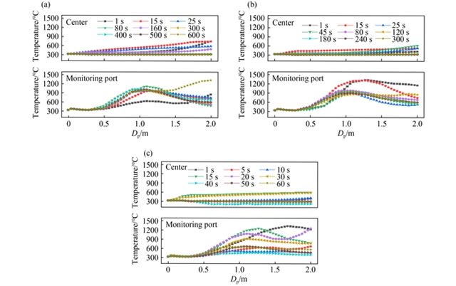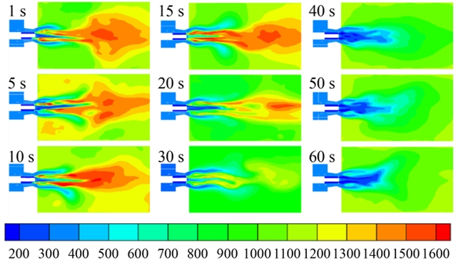 湍流特性分析表明,20%和15%负荷下的湍流强度(TI)峰值高于40%负荷。例如,在20%负荷时,x/d=0.1截面的TI峰值达12%,而40%负荷下为10%。湍流动能(k)的分布显示,一次风区域能量在40%负荷最高,而二次风区域在满负荷占优(图2)。数值模拟进一步验证,DPRB在3%·min-1升负荷速率下,火焰高温区(1300 ℃)覆盖更广,且点火位置距喷嘴0.65–0.70 m,避免局部过热。相比之下,原型燃烧器在相同速率下因一次风速度过高,火焰扩散受限,30秒后温度骤降至600 ℃以下并熄火(图3-4)。