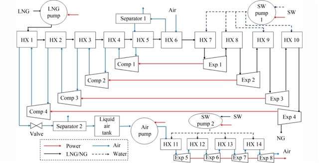 在直接膨胀机(DEE)系统中,LNG通过加压后膨胀发电,其简单性和高能量回收效率(最高达68.12%)使其成为基础技术之一(图1)。然而,DEE的单独使用往往无法充分挖掘冷能潜力,因此常与其他技术结合。例如,Lee等人提出的LNG-液体空气储能(LAES)系统通过冷能存储进一步提高了能源利用率,其往返效率(RTE)达到135.98%。