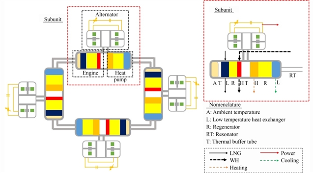 斯特林发动机(SE)因其结构简单且适用于低温热源,在LNG冷能利用中表现出独特优势。研究表明,SE系统的热效率可达71%,同时每年可减少30.6吨CO2排放。尤其是热声斯特林发动机,通过优化负载电阻和再生器尺寸,进一步提升了系统性能(图2)。