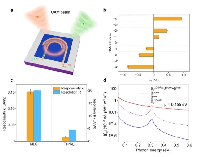 图1. 基于多层石墨烯的维度增强中红外涡旋光探测。(a) 由带有U形电极的OAM探测器件收集的径向OPGE响应示意图。 (b)CPGE成分JC作为轨道角动量阶数m的函数。(c) OPGE 响应度和轨道角动量分辨率的比较。(d) 二维费米子的OPGE响应系数作为光子能量及其他分量的函数,并与三维费米子的比较。