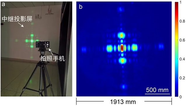 图2. rPMT应用于远距离微尺度目标探测 (a) 实验场景,(b) 拍摄的衍射功率谱图
