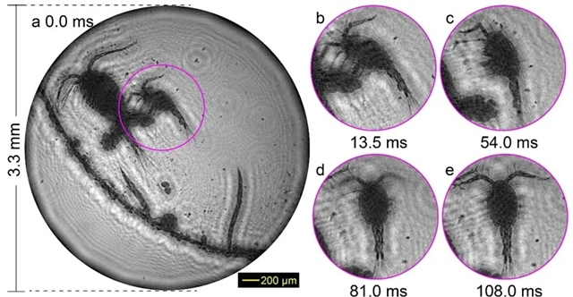 研究团队采用rPMT技术对生活于玻璃器皿中的活体剑水蚤进行了动态显微成像(如图4(a-e)所示),工作距离达到1米以上,景深超过10厘米,成像分辨率达到2.76微米,视场超过3.3毫米。进一步将相机以连续拍照方式(该相机最大帧频为74 Hz)采集功率谱图像序列并进行重建,获得的重建图像序列可合成为帧频74 Hz的视频,该视频清晰展示了剑水蚤的精细结构和一系列快速运动过程,展示了该技术的活体生物医学显微成像应用价值。