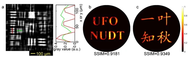 图3. rPMT应用于远距离微尺度目标探测 (a) 分辨率测试,(b-c) 两组重建目标