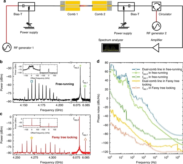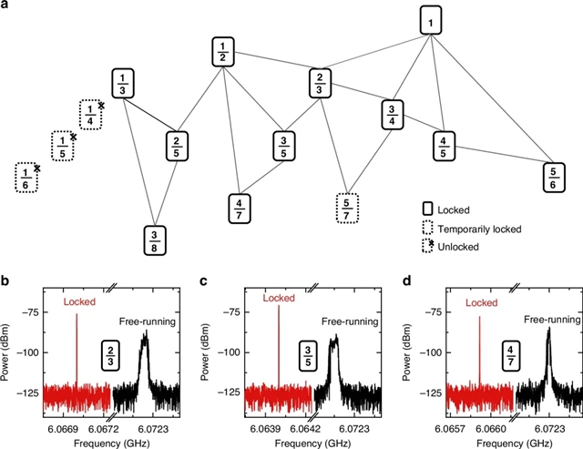 ,我们可以精准预测可实现锁定的法里分数。对比自由运转状态,法里树锁定状态下的电学模间拍频线宽显著变窄且信噪比提升了约10 dB(见图1b-d)。