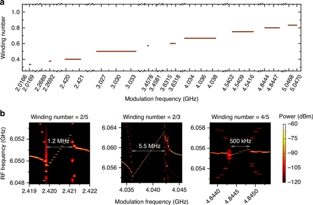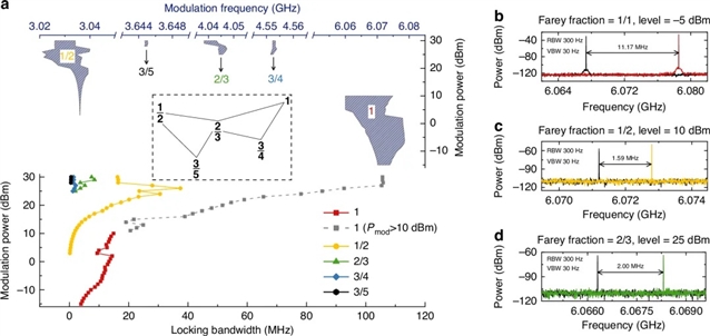 随后,研究团队对法里树锁定带宽进行了评估。如图2a所示,随着调制功率的逐渐增加,不同法里分数下的锁定带宽也逐渐增大。图2同时绘制了以调制频率为横轴,调制功率为纵轴的锁定区域图,显示了在非线性光学中常见的阿诺德舌结构。阿诺德舌揭示了随着调制深度(调制功率)的减小,锁定带宽逐渐收缩的现象。此外,对比共振注入(法里分数1/1),法里树锁定状态下的模间拍频呈现平稳的噪声基底特征(图2b-d)。