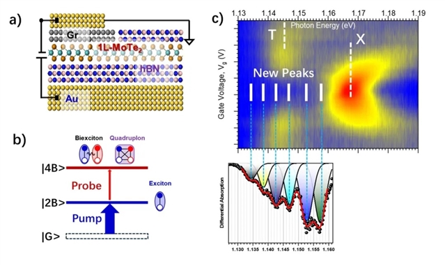 由宁存政领导的深圳技术大学和清华大学团队报道了发现二维半导体二碲化钼中新型四体准粒子(四子)存在的实验证据。该团队采用单层二碲化钼(MoTe2)作为核心材料,将其包裹于上下两层氮化硼(BN)绝缘层之间,顶部通过金属电极与二碲化钼形成电接触,底部氮化硼层下方设置栅电极(见图1a)。利用超快泵浦-探测技术,用强泵浦脉冲激发材料,再用弱探测脉冲分析其光吸收特性。通过调节栅压、泵浦强度、延迟时间、探测光子能量和偏振、以及温度等参数,他们系统地研究了吸收光谱响应的演变规律。