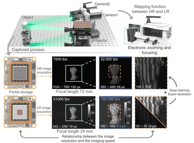 针对结构光三维成像中对高时空分辨探测的迫切需求,南京理工大学研究团队近日提出了一种基于深度学习的超时空分辨单帧结构光三维成像方法,该工作以“Single-shot super-resolved fringe projection profilometry (SSSR-FPP): 100,000 frames-per-second 3D imaging with deep learning”为题,发表在《Light: Science & Applications》期刊。该方法通过部分读出成像窗口来实现成像帧频的显著提升,并结合建立的物理域调控信息与后端统计模型的关联信息即可实现高分辨率(超时空分辨探测)绝对相位的精确解耦,有效突破成像系统硬件的物理极限瓶颈(图1),从而使三维成像速率提高一个数量级以上。研究团队通过对不同类型瞬态场景进行实验演示,包括旋转的涡轮风扇叶片,爆炸的建筑块,蒸汽机的往复运动等,展示提出方法在100,000 Hz下的超快三维成像能力。