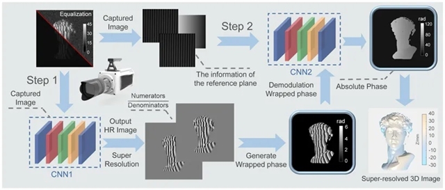 如图2所示,SSSR-FPP仅使用一对低信噪比、低分辨率的条纹图像作为输入,而高分辨率的绝对相位则可以通过特定的训练网络进行解耦。SSSR-FPP采用了两个结构相似但功能不同的卷积神经网络(CNN1和CNN2),它们独立且顺序地进行训练以实现高分辨的相位复原及相位展开。其中,SSSR-FPP方法通过将镜头焦距增加三倍的方式(从24 mm电控调焦到72 mm)以实现高低分辨数据之间的映射学习。这一策略使得SSSR-FPP的成像框架能够结合具有“物理意义”的图像形成先验知识,更加可靠地学习潜在信息,并“重建”丢失的空间分辨率。