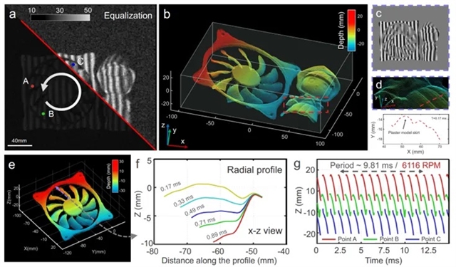 图3. SSSR-FPP方法对旋转叶片和静态被测物体的三维成像结果。