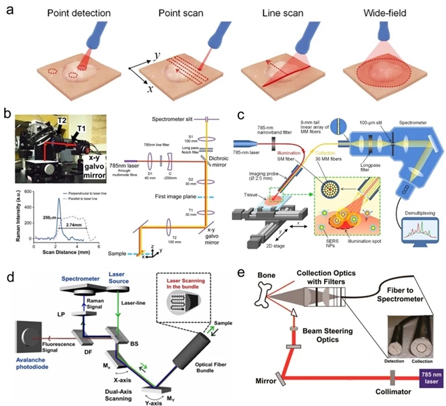 仪器仪表的创新推动了体内SERS技术发展。在通用性的考量中,785nm激光因其综合性能被广泛使用,1064nm用于NIR - II窗口需注意组织加热;物镜选型影响激光光斑与功率密度;CCD探测器选择要平衡多种因素。基于显微镜配置,早期扫描成像速度慢,而线扫描技术如SARI系统提升了成像速度与视野(图2b);光纤配置的设备不断演进,如SpectroPen等用于术中检测,偏移式拉曼光谱和表面增强的偏移式拉曼光谱增强了检测厚组织的能力,新的光纤探针基于NIR拉曼成像系统集成新技术且性能优良(图2e)。