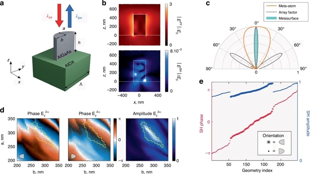 作者使用的非线性超表面由[100]晶向的Al0.18Ga0.82As谐振器单元在AlOx衬底上周期性排列组成。首先,AlGaAs合金(n>3)和氧化铝(n=1.6)之间的高折射率差使得基频(FF,λ=1550nm)和二次谐波(SH,λ=775nm)实现光共振,并实现电磁场的紧密束缚。其次,选择谐振器单元的几何形状以确保垂直于表面的定向SH发射。作者对之前常用的谐振器单元形状进行了关键性的修改,即考虑半椭圆圆柱体(图1a)。作者通过仿真得到在正常泵浦入射下,该结构在谐振器单元内(图1b)以及在轴向上有明显的场强束缚和SH发射波瓣(图1c)。此外,图1d中的图谱显示,通过改变谐振器单元的长半轴a和短半轴b,可以在很大程度上调节轴上SH远场的相位和振幅。最后,将所需相位与图1d中的分布进行对比,选择最匹配的谐振器单元。作者根据需要提取了部分参数的谐振器单元如图1e所示。