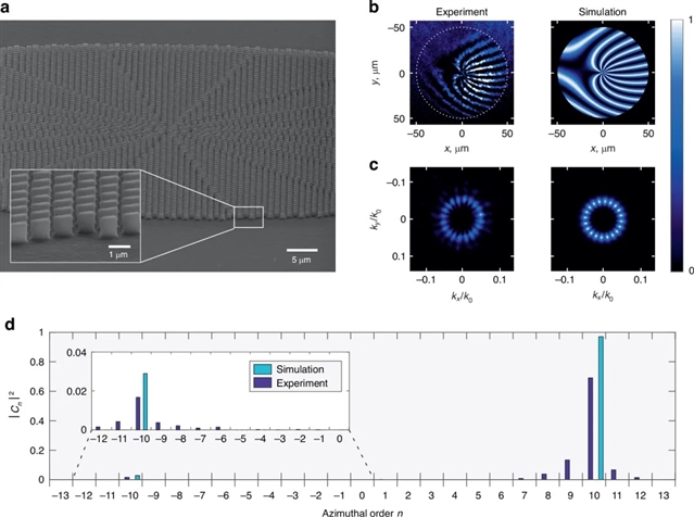 本文中,作者成功产生拓扑荷为1-10的SH涡旋光束,实验与模拟高度吻合。并发现了鬼涡旋现象,通过系统分析确定其原因为不同谐振器单元几何形状的SH产生效率存在微小的差异,而非制造缺陷。另外还证实了所有SH涡旋光束为标量且线性偏振,且SH产生效率较以往的研究有显著提高。