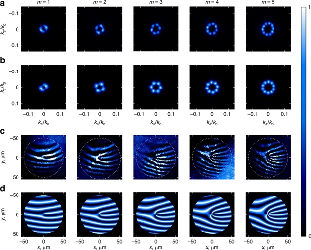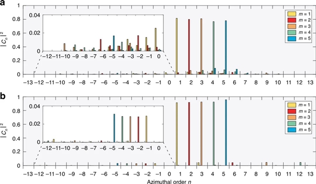 上述m=10的所有结果可以推广到具有其他拓扑荷的SH涡旋光束产生的非线性超表面。作者给出了拓扑荷从1到5的涡旋光束的超表面实验(图3a~c)和模拟(图3b~d)结果。对于所有的值,结果均表明存在一个拓扑荷为–m的鬼涡旋。在不同m的情况下,鬼涡旋的存在都通过模态分解分析得到了证实(图4)。作者通过实验结果与半解析模型的对比,分析解释了鬼涡旋的成因是不同谐振器单元几何形状的SH产生效率之间的微小差异。
