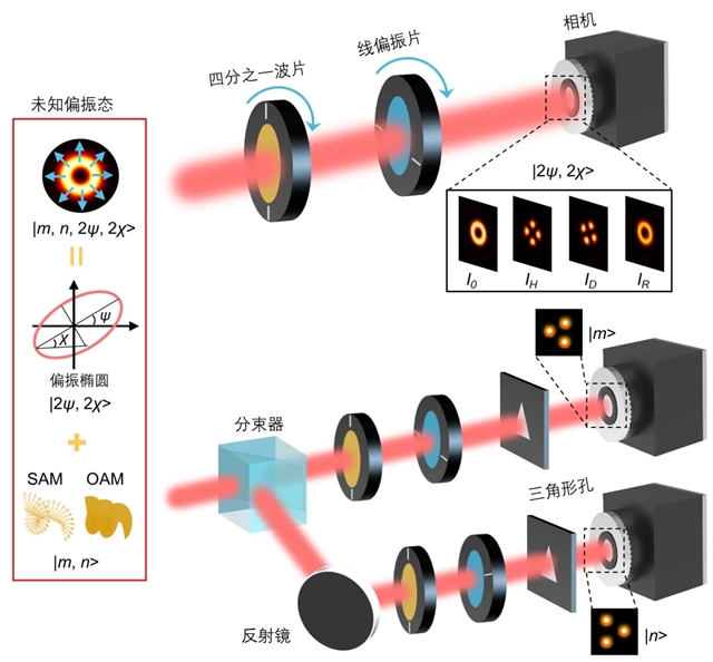 传统的偏振系统测定任意高阶庞加莱球上矢量光束需要级联一系列的光学元件,且需要复杂的测试和数据处理过程,才可以获得矢量光束表征所需的四个参数(|m, n, 2ψ, 2χ>,其中m, n, ψ, χ分别表示矢量光束的自旋、轨道角动量、偏振角和椭偏度),如图1所示。