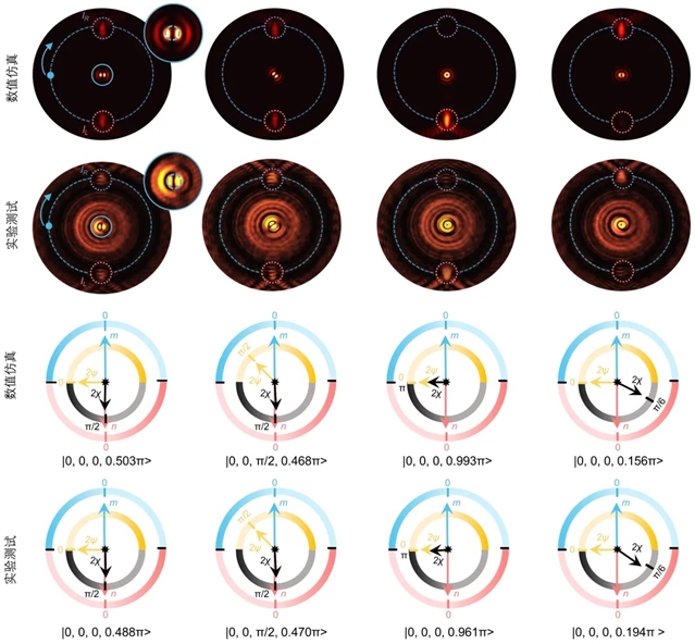 基于单原子超构表面,研究团队展示了能够单摄、快速、精确地测定任意高阶庞加莱球上矢量光束偏振态的偏振钟器件,如图2所示。其基本机制依赖于将矢量光束的光学奇点和斯托克斯参数转换为可视化的能量图案,通过解析该图案,从而提取完全确定光子偏振态的所有参数。超构表面偏振钟巧妙地用四个指针可视化光子偏振态(由四个参数表示),其方式与传统时钟通过三个指针显示时间相类似。
