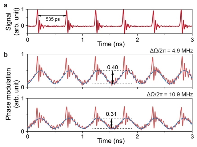 图1. PCF中的声光晶格。(a) 声光锁模激光器的输出脉冲序列。(b) 归一化零差功率信号,其中蓝色虚线为声光晶格振荡曲线。上半部分对应于重复频率失谐量 (ΔΩ/2π) 为4.9 MHz的声场振动;下半部分对应于重复频率失谐量为10.9 MHz的声场振动。