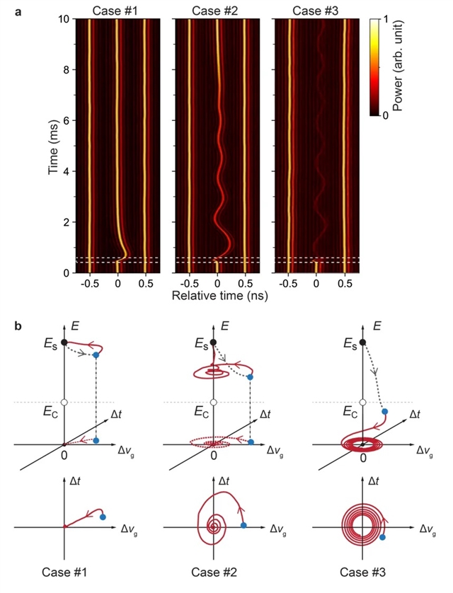 图2. 受扰动的孤子重定时动力学过程。 (a) 受扰动的孤子脉冲的重定时动力学过程(扰动强度由#1到#3逐渐增加)。图中的两条白色虚线表示外部注入脉冲与腔内孤子脉冲相互作用的开始和结束时间。请注意,在每个图中,外部注入脉冲仅扰动中间的孤子,而两个相邻的孤子保持未受干扰。 (b) 扰动结束后a中三种情况的孤子重定时相空间轨迹(红色曲线)的演变。虚线灰色曲线从黑点开始,到蓝点结束,标志着扰动引起的孤子状态的突然变化。