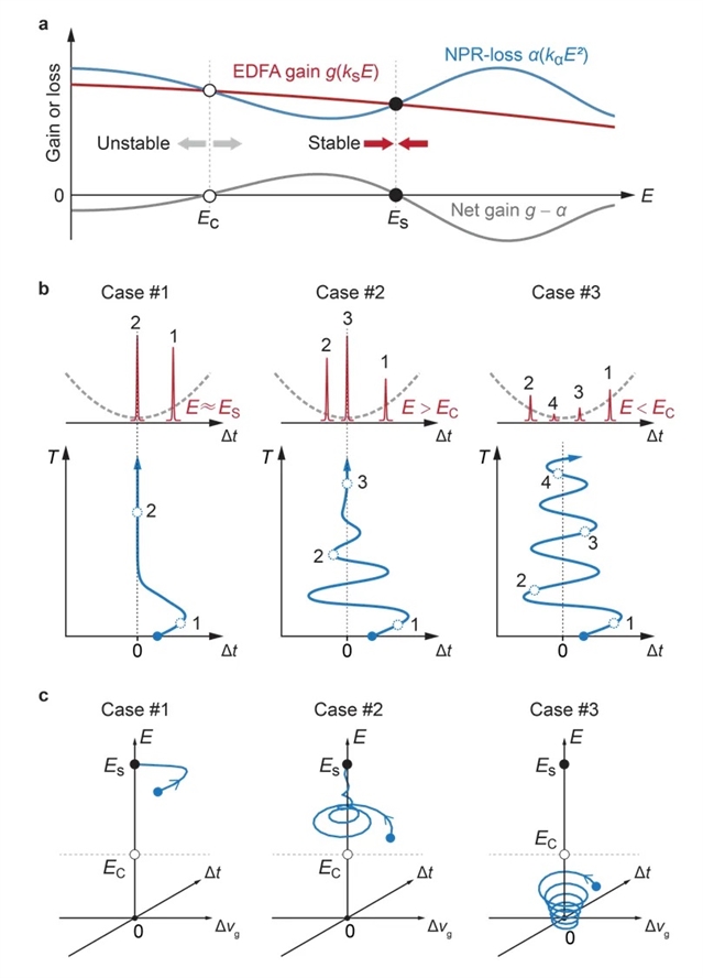 图3. 耗散耦合的动力学模型。 (a) 强度相关的NPR引起的损耗和能量饱和的EDFA增益导致稳定的脉冲能量Es,而存在临界脉冲能量Ec,低于该能量时脉冲会逐渐消失。(b) 三种不同初始条件下重定时动力学主要特征的说明。(c) 对应于b中三种不同初始条件,耗散耦合的动力学模型模拟的重定时过程相空间轨迹。