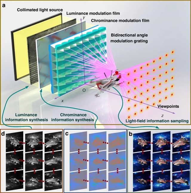 图1:高保真静态光场图像显示系统的示意图。a 系统结构和光路图。b 视差图像阵列示意图。c 色度视差图像阵列。d 亮度视差图像阵列