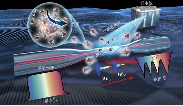 近日,华中科技大学李豪博士和孙琪真教授团队提出了一种带着“气敏外衣”的微纳光纤传感器,如图1所示,该团队通过ZIF-8(沸石咪唑酯骨架-8)薄膜修饰微纳光纤(MNFs*ZIF),作为“外衣”增强对电解液挥发性有机气体的吸收性能,结合微纳光纤高倏逝场光感知特性,实现“气-光”高效耦合转换,进而通过折射率感知实现对锂电池电解液蒸汽泄露的高灵敏检测。相比石英晶体微天平、电化学、热导和金属氧化物半导体等气体传感器,该团队提出的MNFs*ZIF高灵敏、抗电磁干扰、耐极端环境等独特优势,更适合于锂离子电池安全原位在线监测。