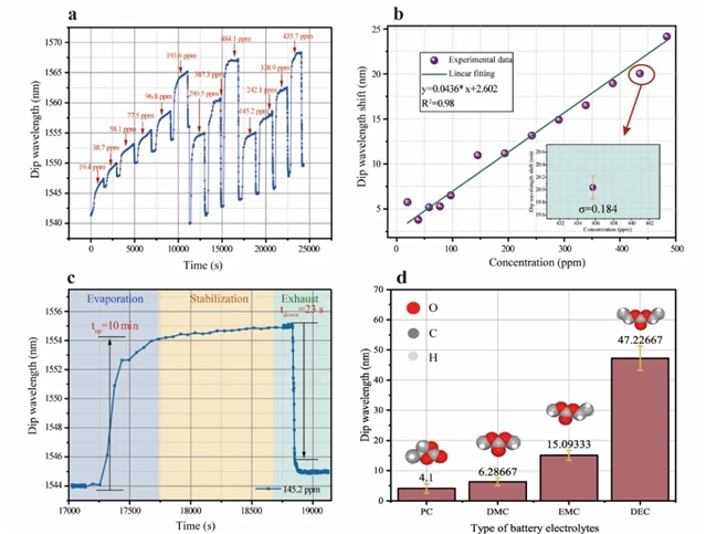 为了获得尽可能高的灵敏度,并综合考虑光纤实际制备控制精度,该论文学者们通过理论建模,综合分析了微纳光纤直径和ZIF-8薄膜厚度对气体灵敏度的调控机理,研究了膜厚对透射光谱的调制作用。综合考虑鲁棒性、灵敏度、精度等因素后,选择接近灵敏度极大值同时又具备较好鲁棒性的7μm直径MNFs作为基底,并修饰一层兼具高灵敏和高消光比光谱调制作用的500nm厚度ZIF-8薄膜。学者们搭建了火焰稳定性提升的CCD辅助拉锥系统,由电动位移台机械牵引、氢氧焰熔融拉锥实现微纳光纤制备;设计了甲醇溶剂中ZIF-8四周期原位自组装方案,通过氢键分子相互作用力,由优化的结晶工艺使ZIF-8原位结晶生长在微纳光纤表面形成“气敏外衣”,实现传感器的制备。验证了该传感器对锂电池常见挥发性气体碳酸二乙酯(DEC)、碳酸甲乙酯(EMC)、碳酸二甲酯(DMC)和碳酸丙烯酯(PC)的检测能力,通过波长解调,MNFs*ZIF传感器在ppm范围内具有43.6 pm/ppm的高灵敏度,在DMC气体检测时理论上检测极限为2.65 ppm,并且实验验证了其出色的可逆性和重复性。