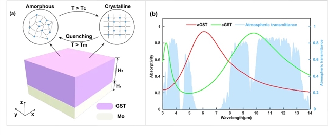 在这项工作中,研究人员提出了一种基于相变材料Ge2Sb2Te5(GST)和耐高温金属Mo的可切换红外隐身双层薄膜,如图1a所示。通过调整GST处于不同的状态,可以灵活控制目标的红外辐射特性,如图1b所示。当GST处于非晶态时,薄膜在3−5μm和8−14μm大气窗口波段的低发射率使其具有有效的红外“隐身”功能。同时,薄膜在5−8μm非大气窗口波段具有较高的吸收率,显著增强了薄膜的辐射散热能力;而当GST转变为晶体状态时,8−14μm波段内的发射率显著增加,使得薄膜被调谐到“非隐身”状态。因此,通过切换GST的状态,可以实现目标在红外隐身和非隐身状态之间的切换,从而实现智能化动态隐身的目的。